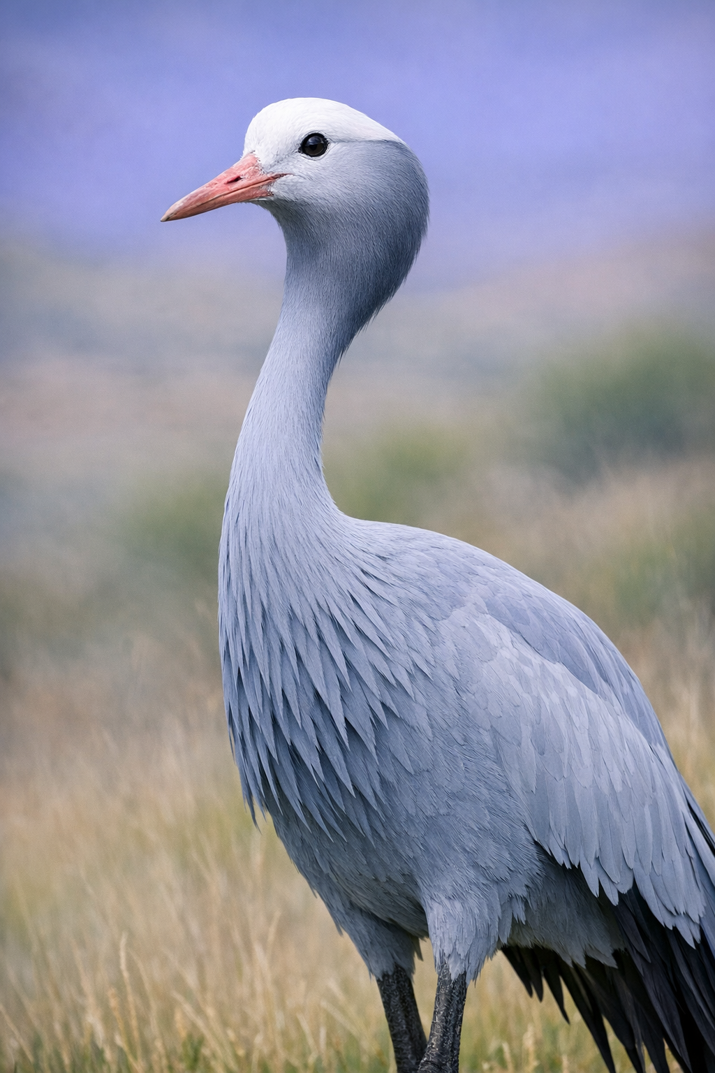 The Blue Crane is a truly eye‑catching bird! It has a surprisingly large head, a long, slim neck, and can grow to about 1 metre tall—almost as tall as some kids. Its feathers are a soft bluish‑grey colour, giving it a calm and graceful look. On top of its head, you’ll notice lighter, almost white feathers, and its long legs and flowing tail feathers make it look like it’s wearing a fancy outfit.